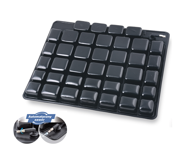 Specjalna wielokomorowa konstrukcja oraz możliwość zmiany twardości poprzez dopompowanie lub upuszczenie powietrza gwarantują wysoki komfort użytkowania. Zastosowanie automatycznego zaworu umożliwia w dowolnej chwili zmianę twardości poduszki w zależności od preferencji użytkownika. Wykonana jest z wysokiej jakości tworzywa odpornego na nacisk. Niezależne komory połączone są w jeden system powietrzny, dzięki czemu umożliwią balans ciała. Nacisk na wybrną komorę, powoduje wzrost ciśnienia w sąsiedniej komorze i tym samym odciążenie poszczególnych części ciała. Dzięki zastosowaniu odpowiedniej technologii zgrzewania poduszka nie rozszczelnia się.